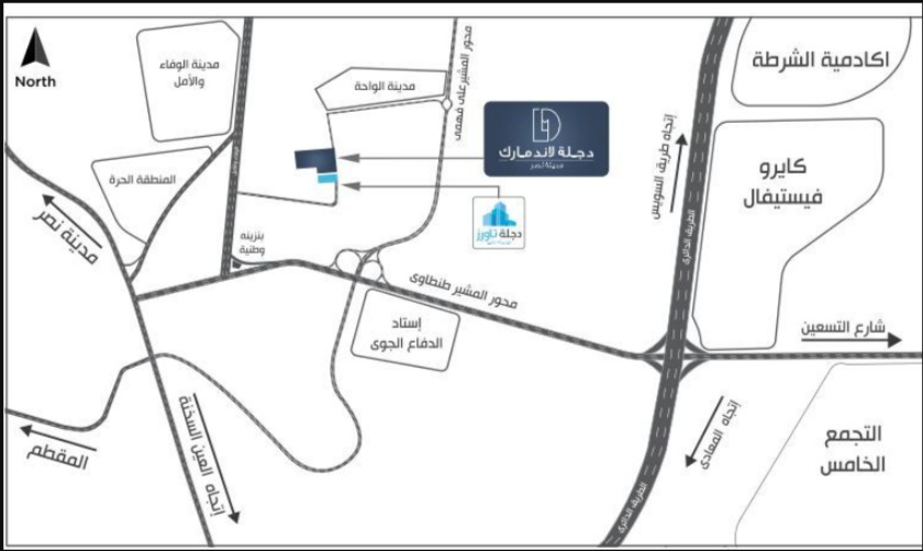 - كما يتواجد دجلة لاند مارك تحديداً عند مدخل المشير طنطاوي، مما يجعله نقطة انطلاق ممتازة للحياة الحضرية.